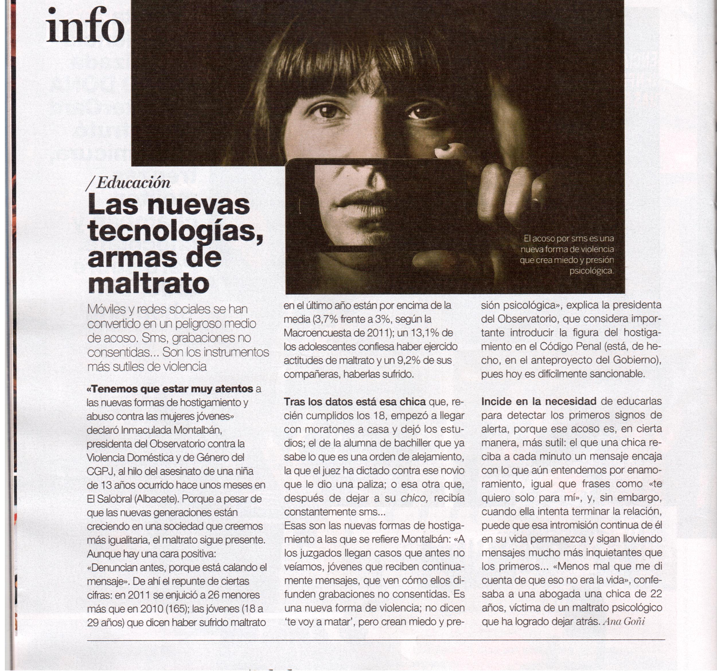 “Tenemos que estar muy atentos a las nuevas formas de hostigamiento y abuso contra las mujeres jóvenes”, declaró Inmaculada Montalbán, presidenta del Observatorio contra la Violencia Doméstica y de Género del CGPJ, al hilo del asesinato de una niña de 13 años ocurrido hace unos meses en El Salobral (Albacete). Porque a pesar de que las nuevas generaciones están creciendo en una sociedad que creemos, o queremos creer, más igualitaria, el maltrato está presente en ellas. Aunque hay una cara positiva: “Denuncian antes, porque está calando el mensaje”. De ahà el repunte de ciertas cifras: en 2011 se enjuició a 26 menores más que en 2010 (165; en 2012 ya llevamos 79); las jóvenes (18 a 29 años) que dicen haber sufrido maltrato en el último año están por encima de la media (3,7% frente a 3%, según la Macroencuesta de 2011); un 13,1% de los adolescentes confiesa haber ejercido en algún momento actitudes de maltrato y un 9,2% de sus compañeras, haberlas sufrido (Igualdad y prevención de la violencia de género en la adolescencia, de 2010). Tras los datos está esa chica que, recién cumplidos los 18, empezó a llegar con moratones a casa y dejó los estudios; el de la alumna de bachiller que, a los 16, ha tenido que cambiar de colegio y ya sabe lo que es una orden de alejamiento, la que el juez ha dictado contra ese novio que le dio una paliza; o esa otra que, después de dejar a su ‘chico’, recibÃa constantemente sms y vÃdeos que él se grababa en la puerta de su vivienda… Esas son, precisamente, las nuevas formas de hostigamiento a las que se refiere Montalbán: “A los juzgados llegan casos que antes no veÃamos, jóvenes que reciben continuamente sms, a las que no dejan de darles toques con el móvil, que ven cómo ellos difunden grabaciones no consentidas. Es una nueva forma de violencia que se mantiene en el tiempo; no dicen ‘te voy a matar’ pero crean miedo, incertidumbre, presión psicológica”, explica la presidenta del Observatorio, que considera importante introducir la figura del hostigamiento en el Código Penal (está, de hecho, está en el anteproyecto del Gobierno), pues hoy es difÃcilmente sancionable. E incide en la necesidad de educarlas para detectar los primeros signos de alerta, porque ese acoso es, en cierta manera, más sutil: el que una chica reciba a cada minuto un mensaje encaja con lo que aún entendemos por enamoramiento, igual que frases como “te quiero sólo para mÔ, y sin embargo, cuando ella quiere terminar la relación, puede que esa intromisión continua de él en su vida permanezca, y suene el WhatssApp a todas horas y sigan lloviendo mensajes mucho más inquietantes que los primeros… “Menos mal que me di cuenta de que eso no era la vida. Menos mal que no me quedé ahÔ, le confesaba a una abogada, hace pocos meses, una chica de 22 años, vÃctima de un maltrato psicológico que ya ha logrado dejar atrás.